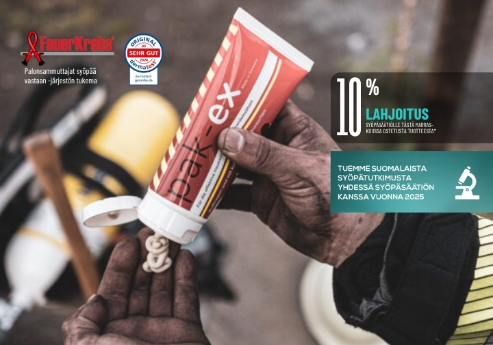 * Lahjoitamme 10 % jokaisen marraskuussa 2025 myydyn Pak-ex-hiusten- ja vartalonpesuaineen ja pesupussin arvonlisäverottomasta hinnasta Syöpäsäätiön kautta suomalaiselle syöpätutkimukselle.