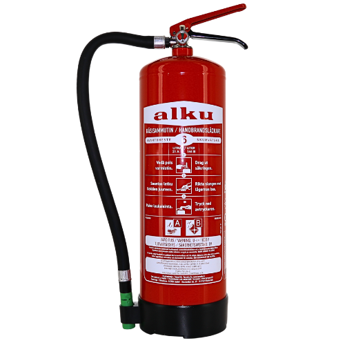 ALKU SD6E on paineellinen kuuden litran PFAS-vapaa vaahtonestesammutin. Sammutteena on vesipohjainen, fluoriton sammutusneste, eli se ei sisällä PFAS-yhdisteitä.