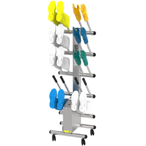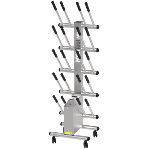 Markkinoiden ainoa skaalautuva saapas- ja kenkäkuivain. Saatavilla eri kapasiteetteina ja yksi- tai kaksipuolisena versiona, HYGIfeet varmistaa korkeavartisten jalkineiden (saappaat, varsikengät, turvakengät jne.) sisäpuolen kuivaamisen ja desinfioinnin. Luotettava, kestävä, taloudellinen ja kompakti teollisuusmalli.