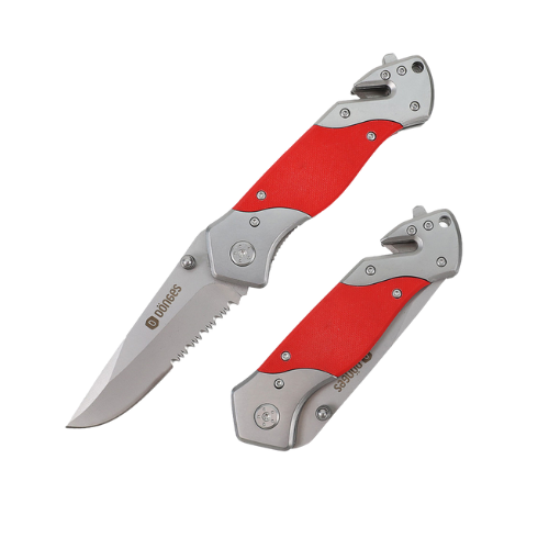 Ergonominen muovikahva liukumattomalla pinnalla varmistaa turvallisen otteen, ja peukalokiinnitys mahdollistaa nopean käytön yhdellä kädellä. Lisäominaisuudet, kuten integroitu vyöleikkuri, lasinsärkijä ja tukeva vyöklipsi, tekevät tästä veitsestä välttämättömän kumppanin hätätilanteissa.