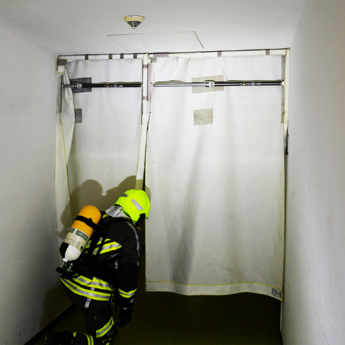 Lämmön- ja liekinkestävästä kankaasta valmistettu kannettava savuverho voidaan asentaa nopeasti oveen tai sisäänkäyntiaukkoon.